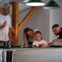 The Castle Resort is suitable for accommodating a total of 48 persons. It consists of 3 four-person suites, 7 double standard rooms, 11 double loft rooms. Our guests can use our wellness section free of charge, which consists of a 120 cm deep, heated pool and a spacious Finnish sauna, complete with atmospheric light elements and a starry sky. In addition, massaging experience elements have also been installed in our pool. During relaxation you can enjoy a wonderful view of the Huta Forest through the huge windows of the pool area.